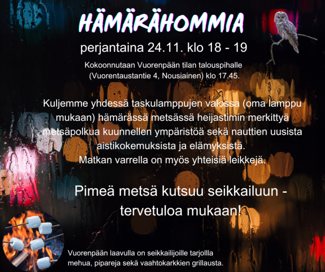 | Ajankohta | Alkaa: 24.11.2023, klo 18.00 Päättyy: 24.11.2023, klo 19.00 |