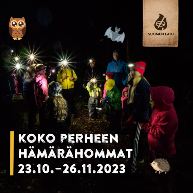 Tervetuloa koko perheen yhteiseen pimenevän illan tapahtumaan. Tutustutaan hämärän kätkemään lähiympäristöön sekä siellä liikkumisen mahdollisuuksiin. Seikkailu koko perheen voimin ja toisten perheiden kanssa saattaa olla juuri sitä, mitä tarvitaan pimeän kesytykseen ja liikkeelle lähtemiseen. Seikkailu on itsessään valmis!