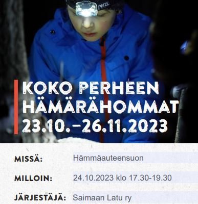 24.10. klo 17.30 tai 19.30 HÄMMÄAUTEENSUON LAAVU Hämärän laskeutuessa metsä muuttuu jännittäväksi, jopa salaperäiseksi. Tule mukaan hämärähommiin koko perheen kanssa! Metsässä kuljetaan heijastimin merkittyä polkua laavulle ja laavulla tehdään erilaisia tehtäviä. Laavulla voi nauttia omia eväitä nuotiotulen ääressä . Hämmäauteensuon sijainti 8 km Lappeenrannasta Lappeenrannasta ja VT6:lta etelään Vainikkalaan menevää tietä (390). VT6:lta noin 6 km, kunnes oikealle viitta "Hämmäauteensuo P-paikka". Polku lähtee P-paikalta.