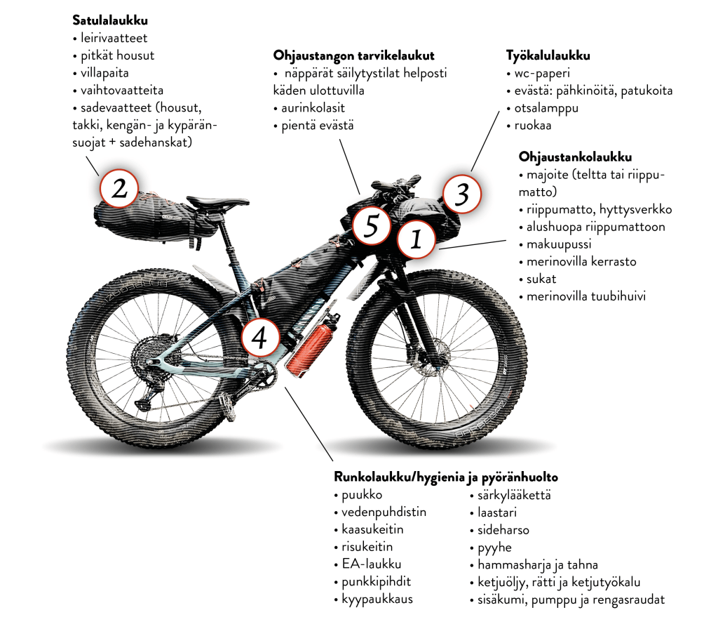 Bikepacking on eräänlaista kevytretkeilyä, sillä kaikki tarvittavat varusteet pitää mahduttaa pyörän laukkuihin, joten se rajoittaa mukaan otettavan tavaran määrää. Koko bikepackingin ydin on sinä, että retkelle on helppo lähteä pyörän kantaessa kaikki varusteesi. Voit itse päättää kuinka pitkälle retkelle lähdet ja kuinka pitkiä päivämatkoja haluat polkea.