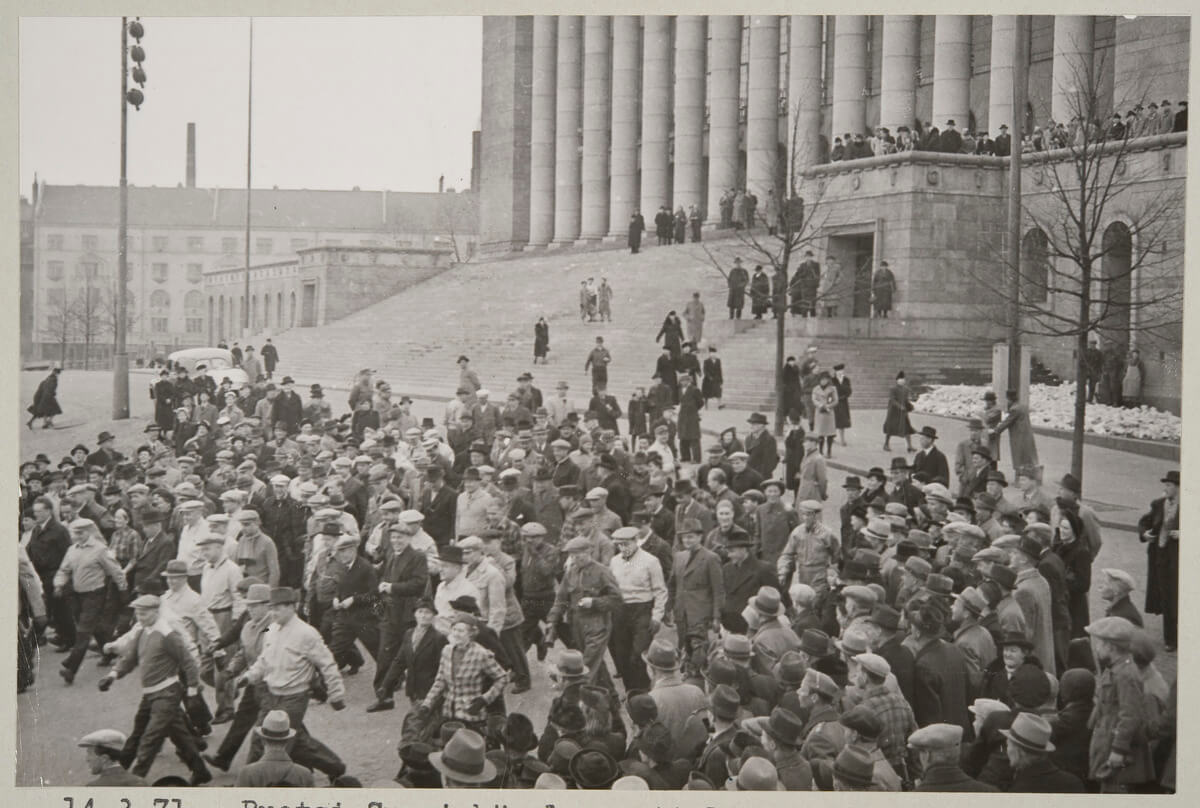 Eduskunta lähdössä marssille 8. toukokuuta. Suomi voitti valtiopäivien keskinäisen kilpailun saatuaan 90 edustajaa, lähes puolet parlamentista liikkeelle. Kuva: Museovirasto.