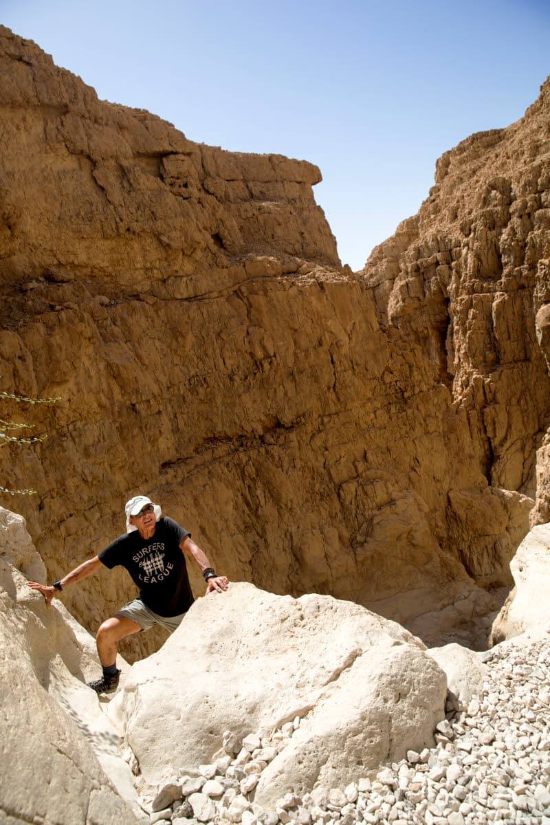 Olemme lähteneet liikkeelle Nahal Tamar- ja Nahal Tzafit-reitille eli Tamarin ja Tzafitin puroille jo pian auringonnousun jälkeen. Varsinkaan kuumana aikana ei autiomaassa kannata kuluttaa voimiaan keskipäivän kuumuudessa. Silloin levähdetään sateenvarjoakasian alla tai vaikkapa luolan suulla ja käytetään tauko energian ja juoman tankkaamiseen.