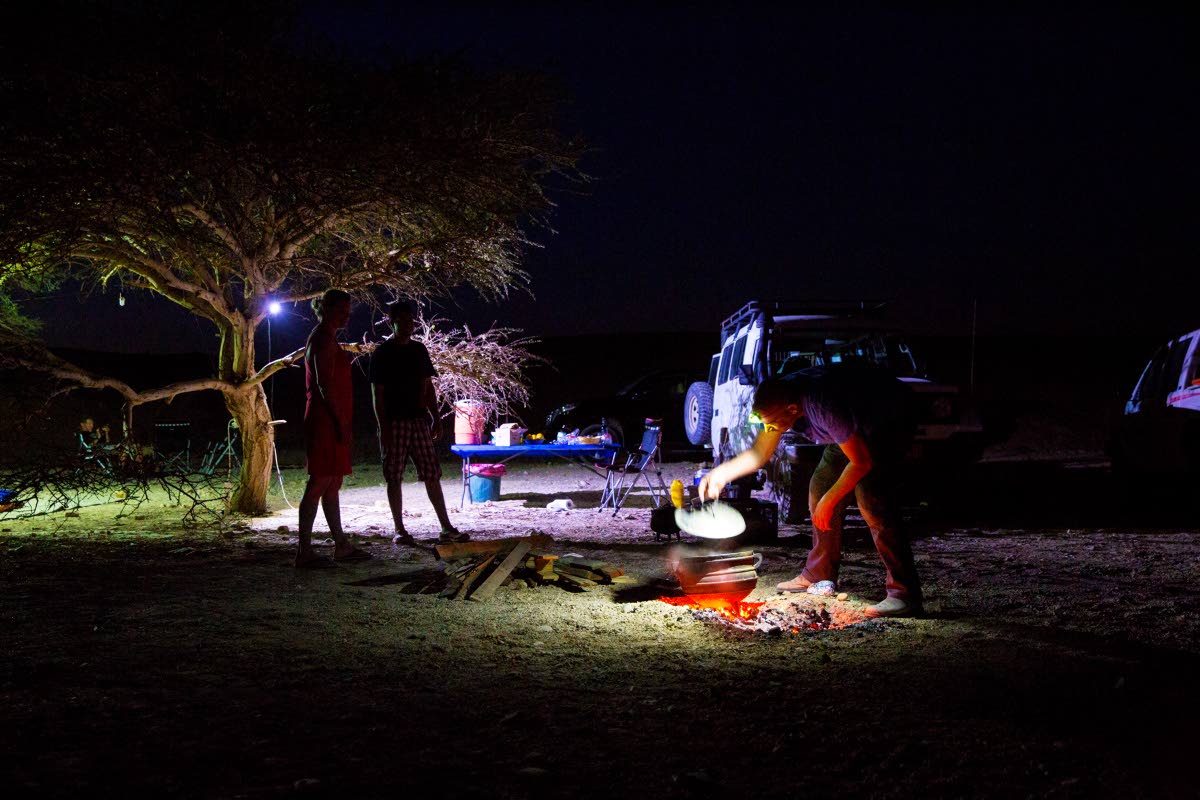 Kun päivä painuu illaksi, palaamme autiomaaleiriimme. Päivälliseksi valmistuu hitaasti rosvopaisti beduiinityyliin: kanaa ja kasviksia kuopassa, nuotion hiilloksen alla kypsennettynä. Tuoksut tuovat veden kielelle. Hyvää kannattaa odottaa. Siemailemme lasin viiniä samalla, kun ilta viilenee. Paikalliset viinit pärjäävät nykyään hyvin kansainvälisten viinitilojen rinnalla. Myös Negevissä viljellään viiniä.