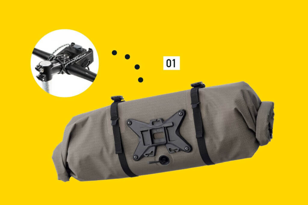 Ohjaustankoon tuleva pidike hankitaan erikseen. Uusi bikepacking-laukku sopii samoihin pidikkeisiin kuin Ortliebin perinteiset tankolaukut ja korit. Testissä oli uusi pikakiinnityksellä varustettu QR Mounting Set, joka kiinnitetään tankoon vahvalla nyörilukolla ilman työkaluja. Tämä versio on helppo irrottaa retken jälkeen tai siirtää pyörästä toiseen.
