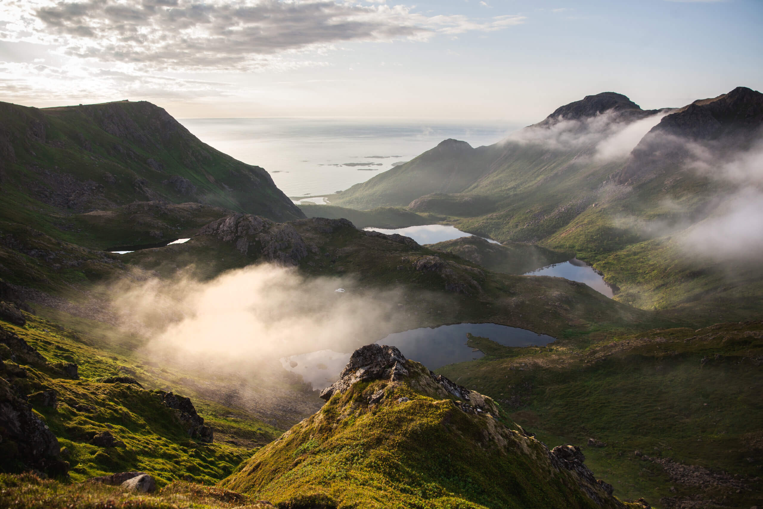 Vuoren päältä avautuu satumaisen kaunis, syvän laakson ja neljän vuoristojärven muodostama maisema yli jääkauden muovaamaan jylhän luonnon kauas Norjanmeren horisonttiin asti. Notkelman pohjalla lepäävät pilvenhattarat ovat pysähtyneet paikoilleen. Ja niin olen minäkin.