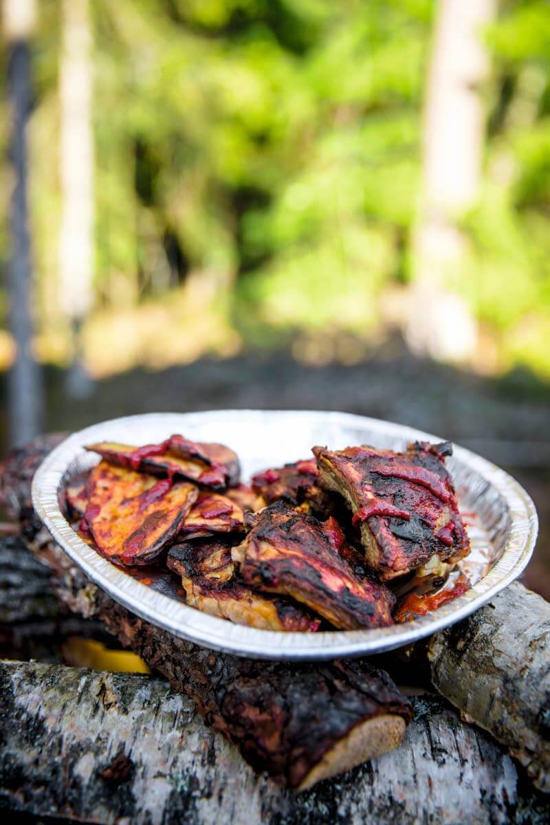 Perinteinen grilliruoka, porsaan ribsit, saa nuotiosta pintaansa vertaansa vailla olevan aromin, jota omatekoiset perunalastut ja wasabiketsuppi korostavat.