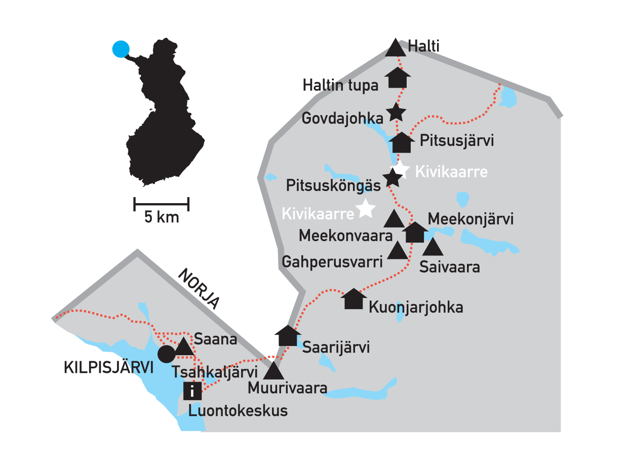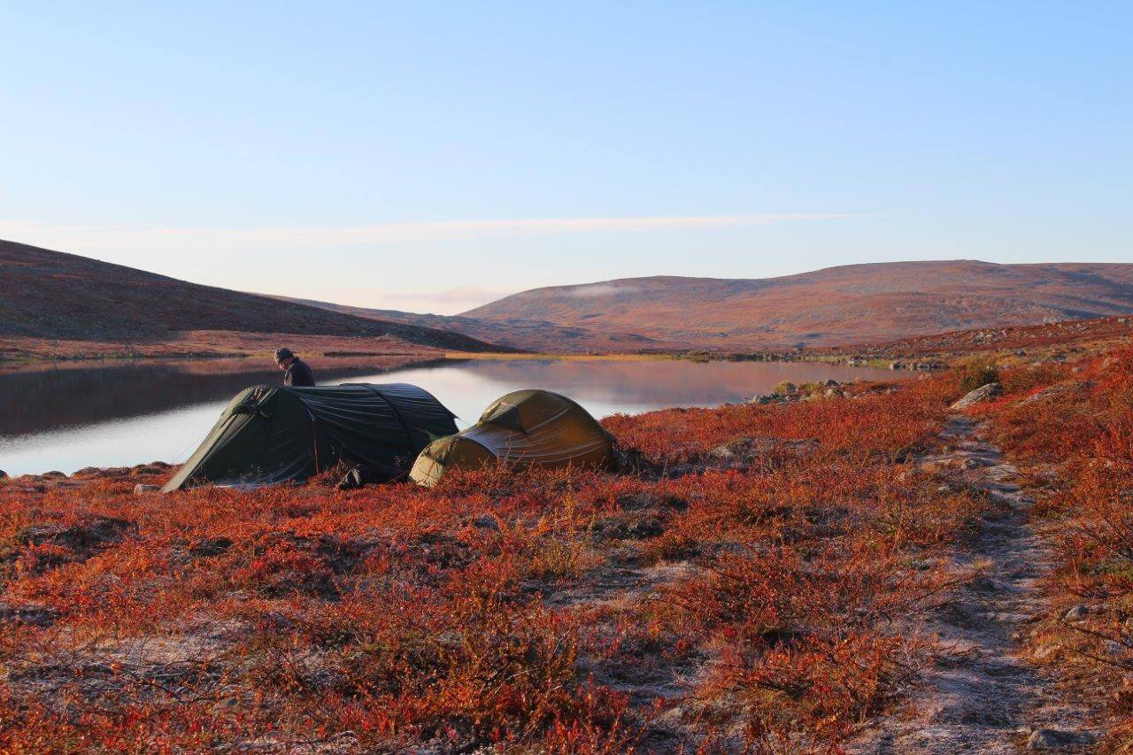 Aamulla telttamme olivat kuurassa. Sinitaivaan alla oijustimme Kalottireitille, jota pitkin patikoimme ensin Saarijärvelle lounaalle ja illaksi Kuonjarjoen autiotuvalle.