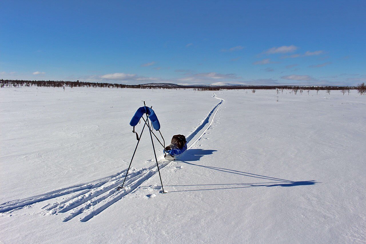 Rankan ylämäen jälkeen tunsin itseni todella tyhmäksi. Kun pysähdyin lepäämään, mieleeni juolahti vilkaista ahkion pohjaa. Siellä oli lunta ja jäätä, jotka nyt raaputin pois. Heti alkoi luistaa normaaliin malliin.