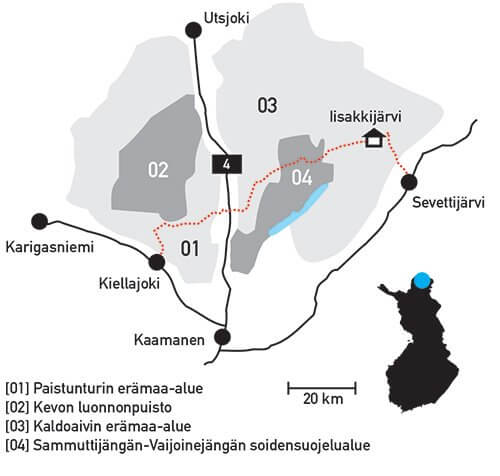 Minua tämä Kevon luonnonpuiston ja Kaamasen välinen kolkka oli kiehtonut jo pitkään ja eritoten siksi, että se on yhä tänä päivänä yksi niistä Suomen erämaiden kolkista, joissa ei tapaa ketään.