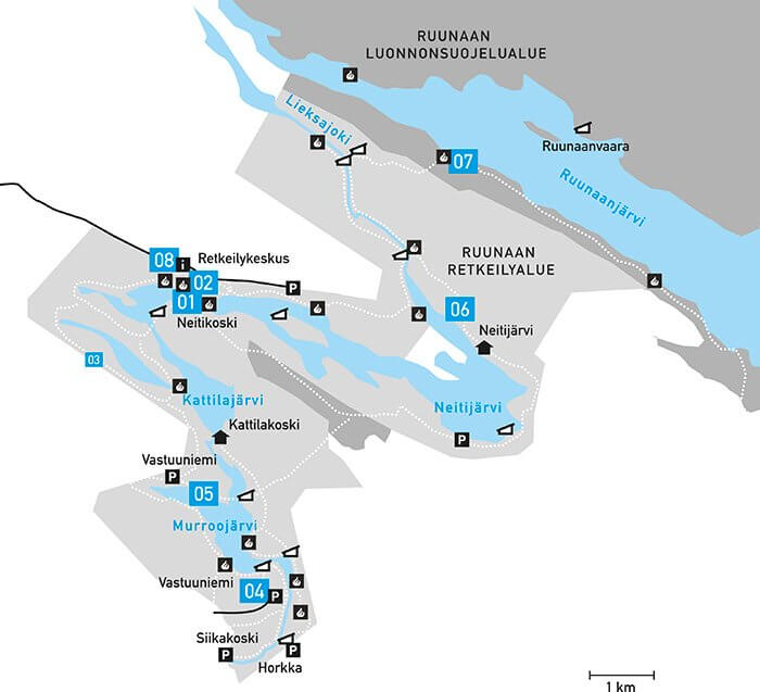 Moni aloittaa retkensä [08] Ruunaan retkeilykeskukselta, läheltä Neitikoskea, missä kesäravintola, vuokramökit ja maksullinen leirintäalue luovat vaivattomat puitteet pienelle luontolomalle. Suoraan hiljaisemmille seuduille halajava suuntaa Miikkulanvaaran pysäköintialueelle ja sieltä Paasikoskea sekä Haapavitjaa ihailemaan.