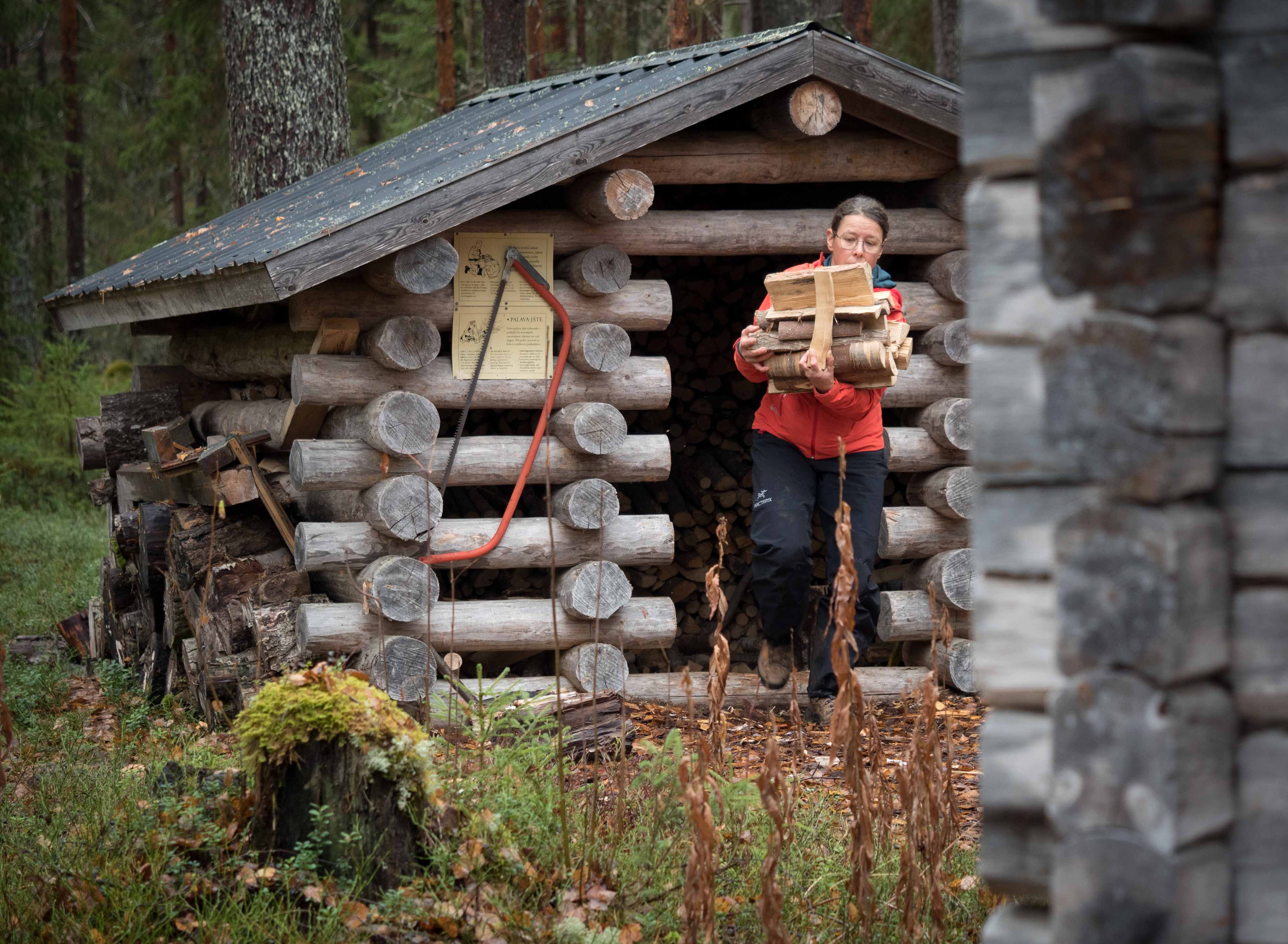 Vilkaisu vieraskirjaan kertoo edellisen illan edesottamuksista. Saunaa on lämmitetty viitisen tuntia ja tupaa saman verran. Laihoin toivein ryhdymme halkohommiin. Kaksikkomme toinen puolikas on armoton halkomestarinna. Hän tekee huolellisen sukelluksen puuvajaan ja löytää kuivaa puuta käyttöömme. Toisen kaveeratessa tuvan huomionkipeän kamiinan kanssa, valmistelee toinen meheviä löylyjä joenvarren saunassa.