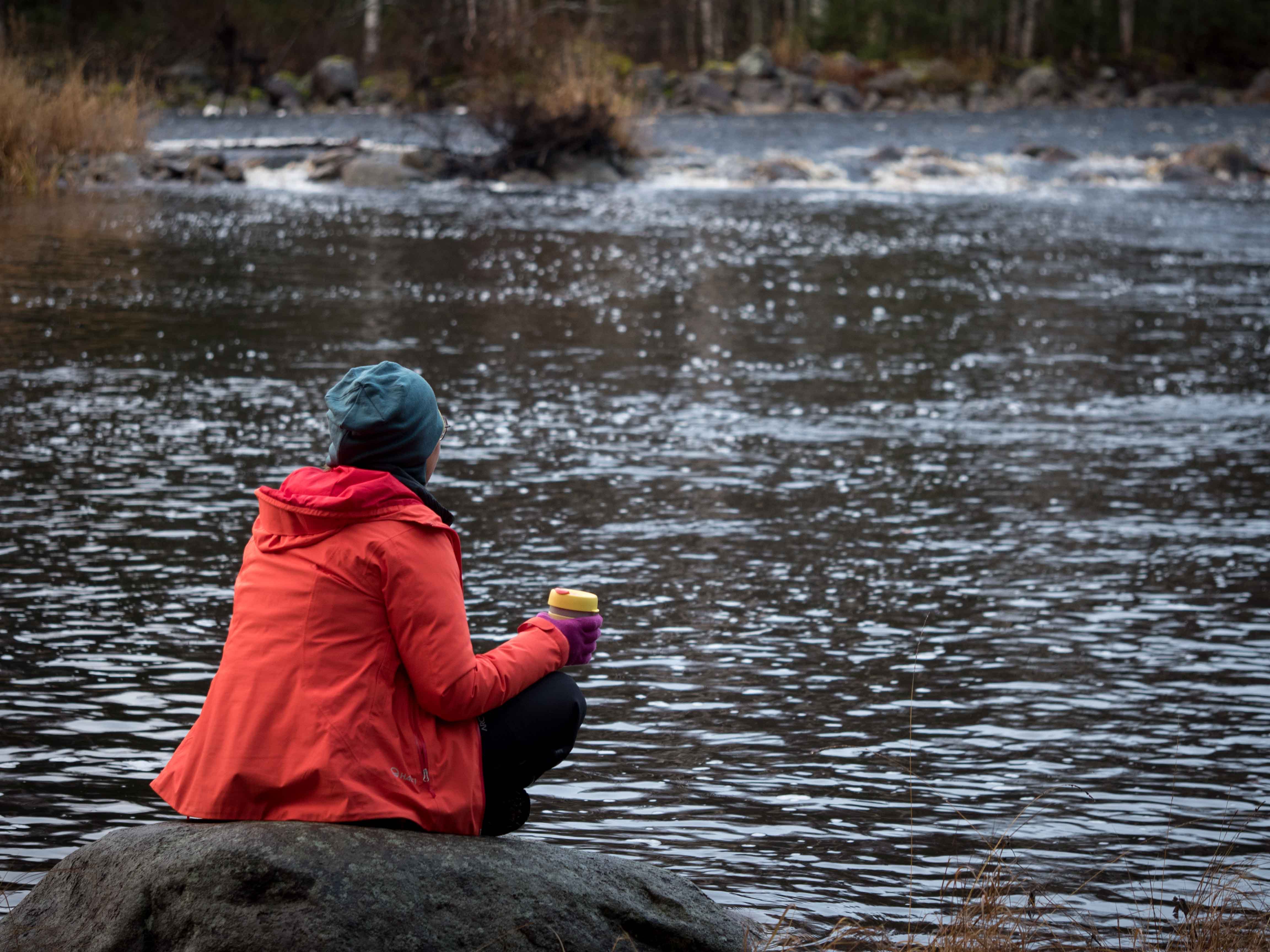 Otroskoski kohisee pimeydessä. Sihisytämme kiuasta ja ihmettelemme, minkä mutkien jälkeen olemme näille lauteille päätyneet. Todellinen taikahattu, mukana kulkenut iloinen syydvesti, on pitänyt sateen poissa polultamme. Saunojaa ei sade haittaa. Kastamme itsemme Jongunjokeen räntärättien laskeutuessa päillemme.