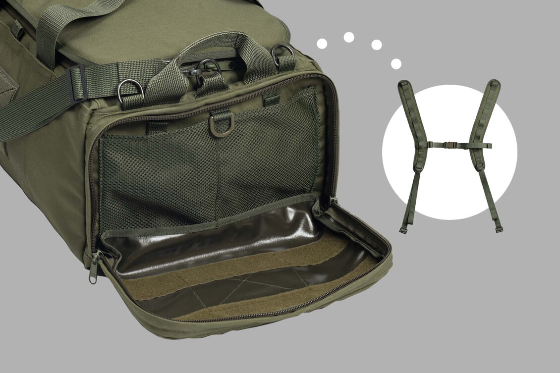 Kantokahvojen ja olkahihnan lisäksi laukun päädyissä on erilliset nostokahvat. Lisävarusteena voi hankkia olkaviilekkeet, joiden avulla laukkua voi kantaa selässä.