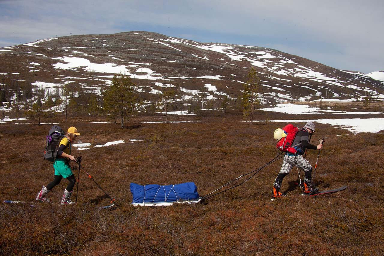 Alkumatka saatiin kiskoa varusteita paljailla pälvillä melkein kilometrin verran ennen kuin hieman liukkaampaakin kulkualustaa alkoi vähitellen löytyä ahkion alle.