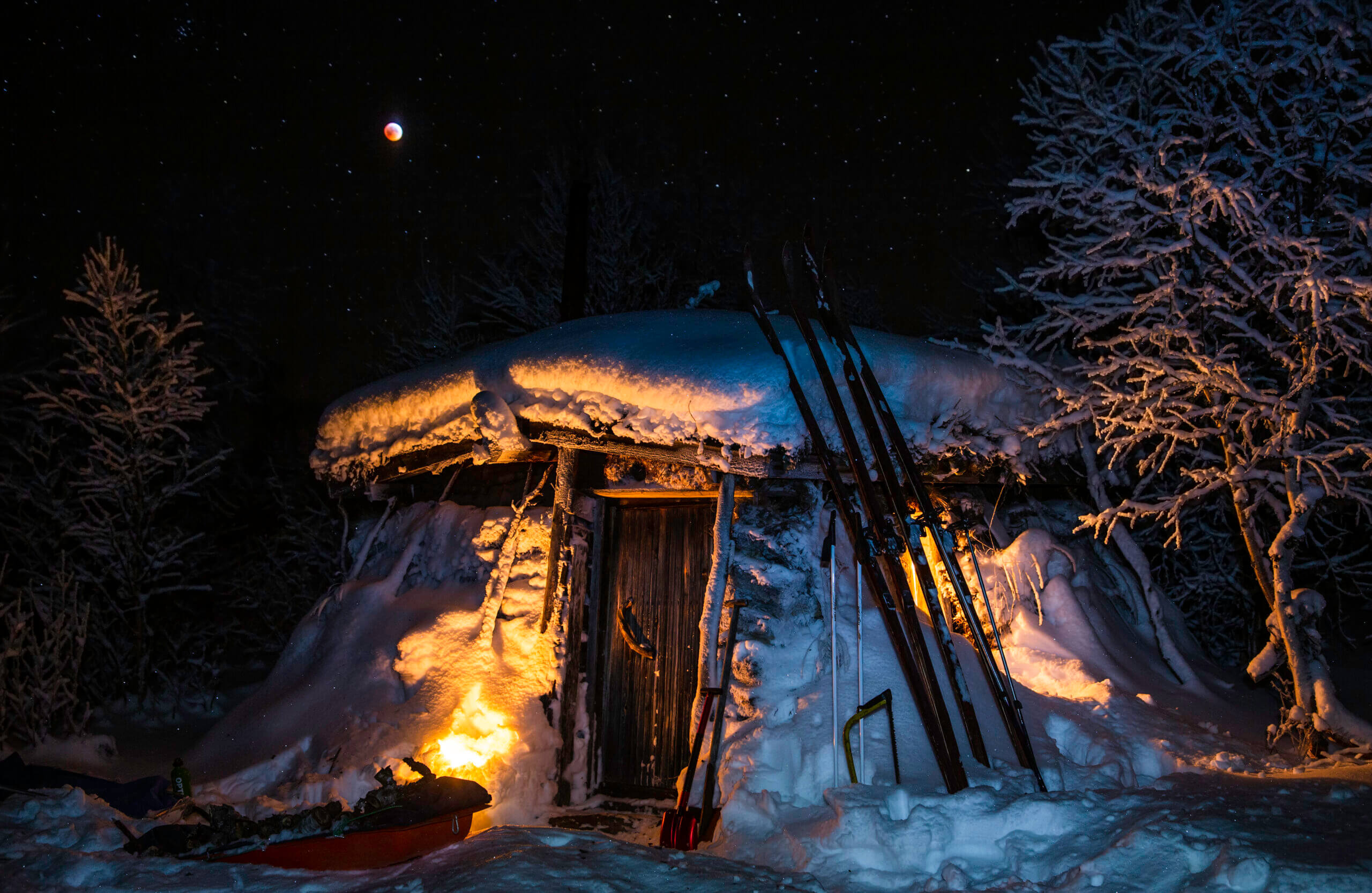 Hiihdämme kuutamon valossa Karigasniemen tieltä vaelluksen ensimmäiseksi yöksi Riekonpyytäjän kammina tunnetulle turpeella vuoratulle asumukselle. Ympärillä kohoavat komeat tunturit toimivat tällä kertaa kuunpimennyksen näyttämönä.