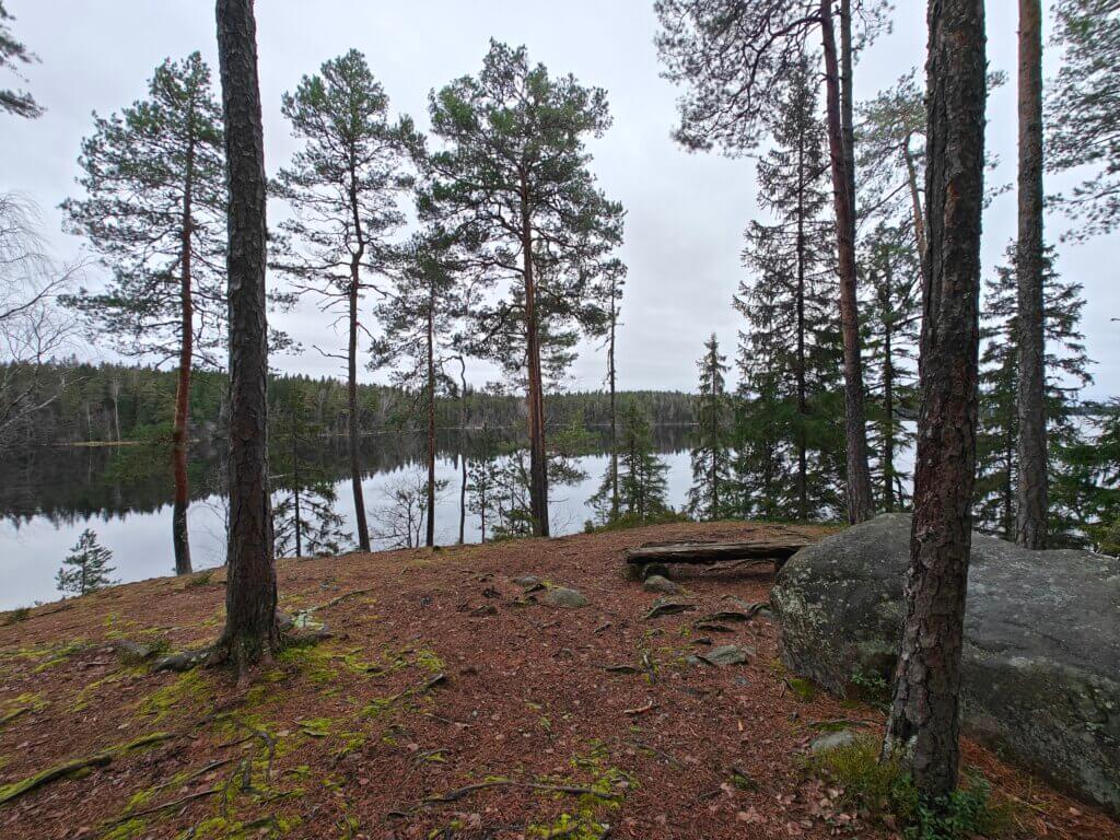 Niin suloinen kuin ikikuusikon suoja onkin, kaipaa ihmismieli herkästi myös vesinäköaloja. Liesjärvi avartuu metsän vierellä osan matkasta, ja Ahonnokan kärjessä polku nousee kalliolle, josta on hienot näköalat järvelle. Ota termoskahvit ja kuksat mukaan, jos haluat pitää pienen evästauon kalliolla. Tulipaikkaa ei kierroksen varrella ole, mutta sellainenkin löytyy ihanalta pikku hiekkarannalta Korteniemen pihapiirin tuntumasta.