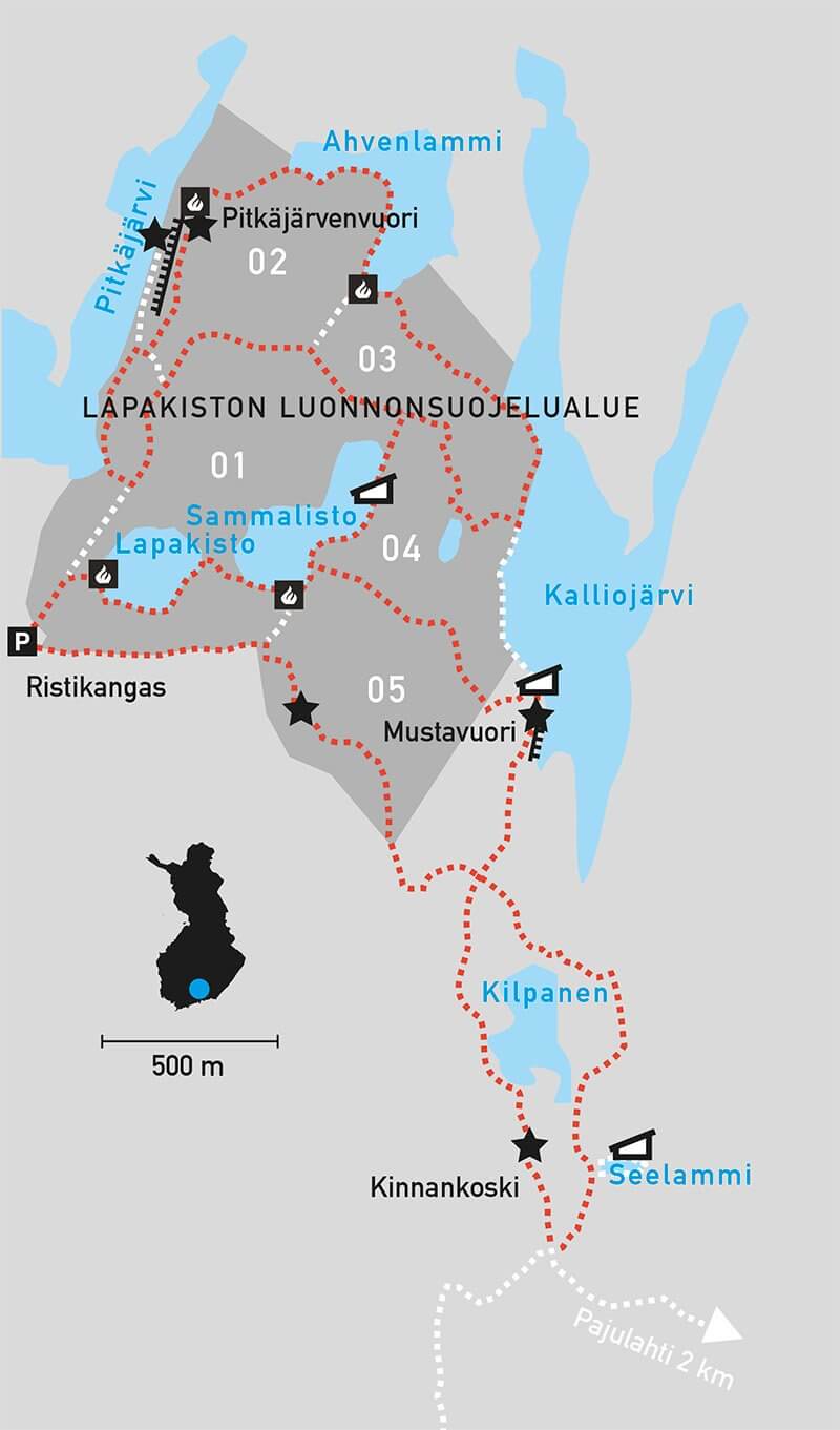 [01] Sammalistonpolku, [02] Pitkäjärvenpolku, [03] Ahvenlamminpolku, [04] Kalliojärvenpolku, [05] Mustavuorenpolku