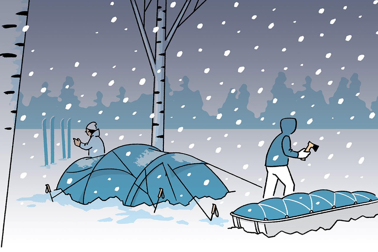 Juttusarjassa ratkotaan kuvitteellisia pulmia, jotka liittyvät jokamiehenoikeuksiin, velvollisuuksiin ja retkeilyalueiden rajoituksiin. Tällä kertaa pystytetään leiri rankan hiihtovaelluspäivän päätteeksi.