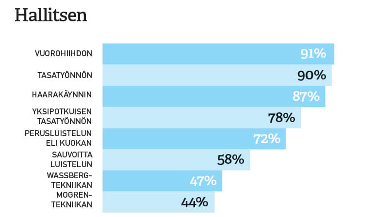 Erilaisten hiihtotekniikoiden hallitseminen on keskeinen kysymys, kun puhutaan vauhdista ja hiihdon taloudellisuudesta. Barometrin vastaukset antavat osviittaa hiihtotaidoista, vaikka eivät sinänsä ota kantaa siihen, kuinka hyvin kukin tekniikkansa hallitsee. Kysymykset on esitetty kaikille, ja vastausten tulkinnassa on hyvä muistaa, että perinteistä ilmoitti hiihtävänsä 85 % ja vapaata 61 % vastanneista.