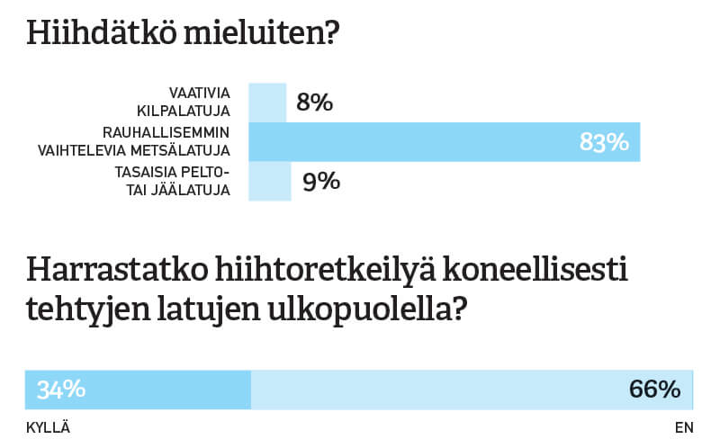 Hiihto on yksi suomalaisten suosikkilajeista. Samaan aikaan kun avasimme harrastajille tähän juttuun liittyvän kyselyn, kysyimme Taloustutkimuksen kautta 500 suomalaiselta, olivatko he käyneet talven aikana ladulla.
