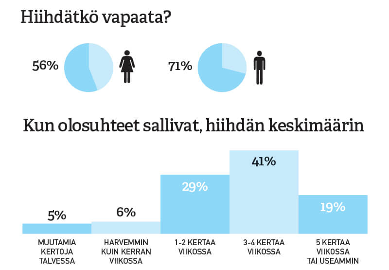 Olosuhteiden salliessa suomalainen lähtee ladulle kolme kertaa viikossa ja hiihtää 10–15 kilometrin lenkin. Vauhtia hän pitää kympin tunnissa, vapaalla hieman enemmän. Kauden aikana kilometrejä kertyy vajaat viisisataa.
