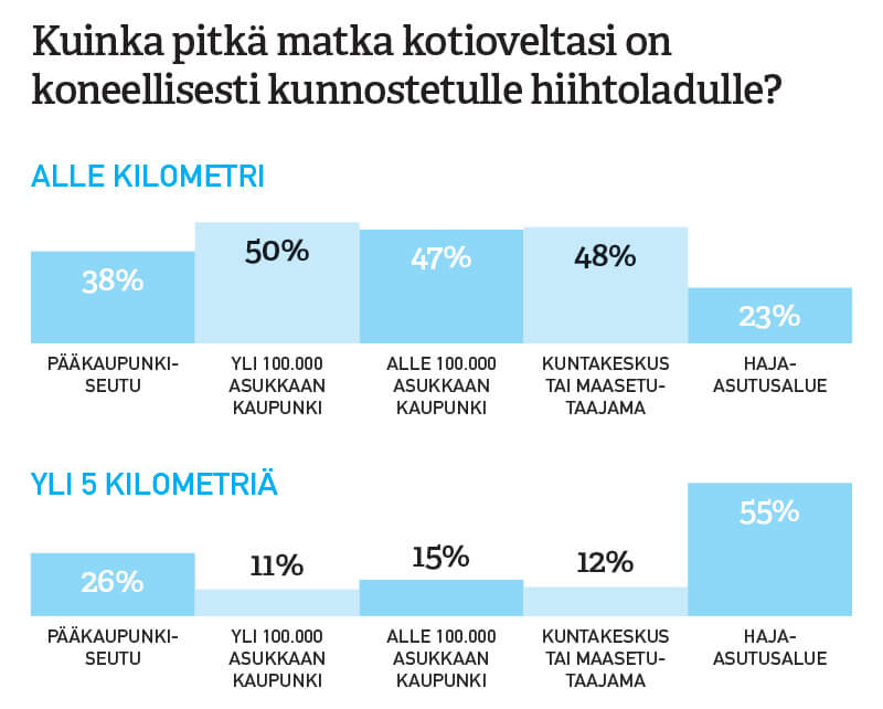 Pisimpiä matkoja tekevät joka tapauksessa haja-asutusalueiden asukkaat. Lumitilanteen suosiessa noin puolet kaupunkien ja taajamien hiihtäjistä asuu alle kilometrin päässä lähimmästä hiihtoladusta. Poikkeuksen tekee vain pääkaupunkiseutu, jossa välimatkat ovat vähän keskimääräistä pidempiä.
