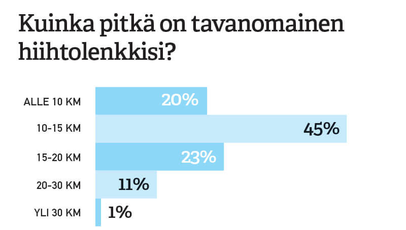 Lenkkien pituudet voivat vaihdella paljonkin. Lapin hiihtoviikolla kilometrejä kertyy helposti saman verran kuin etelän tykkilumiladuilla kuukaudessa. Kysyimme tavanomaisen hiihtolenkin pituutta, ja se tavanomainen kuvaa tässä ihmisen arkea.