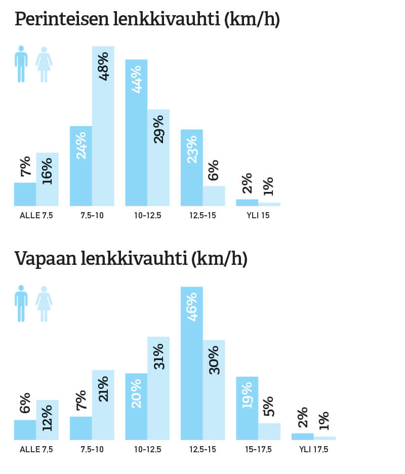 Seuraavista grafiikoista omaa mukavuusvauhtiaan voi verrata noin 2 000 hiihtäjän otokseen. Naisten ja miesten välille syntyy eroja jo pelkästään fysiologisista syistä. Perinteisellä keskivauhti kulkee kympin molemmin puolin – miehillä hieman yli ja naisilla alle. Vapaata hiihdetään tunnissa kolmisen kilometriä enemmän.
