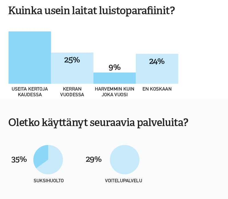 Palveluna suksihuoltoa kertoo ostavansa noin kolmannes vastaajista. Toisin sanoen kyselystä piirtyy kuva siitä, että suksien voitelu on olennainen osa harrastusta tai ainakin välttämätön paha, joka tehdään itse.