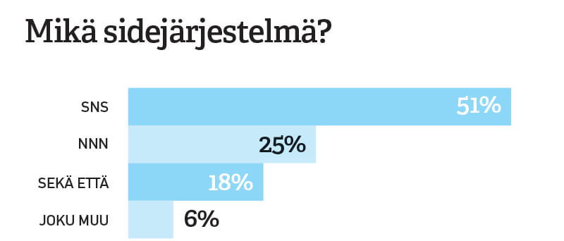Kyselyn perusteella sinne on kuitenkin vielä matkaa. Suomessa SNS-järjestelmällä on vahva asennuskanta ja yli puolet hiihtäjistä on edelleen sen piirissä. Kyselyssä NNN-järjestelmään laskettiin siihen sopivat Prolink ja Turnamic.