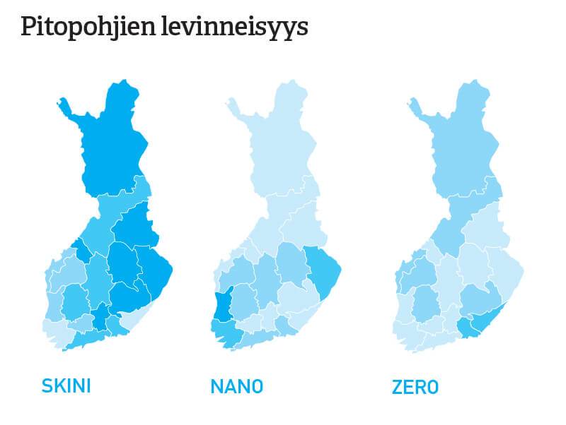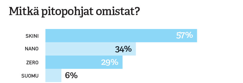 Skinisuksi on lyönyt läpi. Se on noussut lyhyessä ajassa selvästi suosituimmaksi pitopohjaksi melkein koko maassa. Prosentuaalisesti nanosukset ovat suosituimpia vain Satakunnassa ja Varsinais-Suomessa.