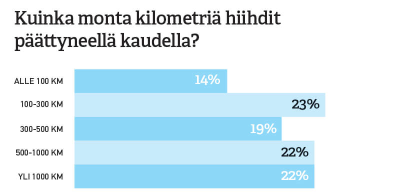 Kysyimme, kuinka paljon kilometrejä hiihtäjät keräsivät viime talven aikana. Lumitilanteen puolesta kausi oli keskiverto, jopa hyvä. Suuressa osassa maata hiihtämään päästiin melko myöhään, mutta tammikuulta huhtikuulle hiihdettiinkin sitten katkeamattomissa luonnonolosuhteissa eteläisintä Suomea myöten.
