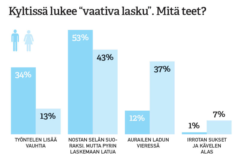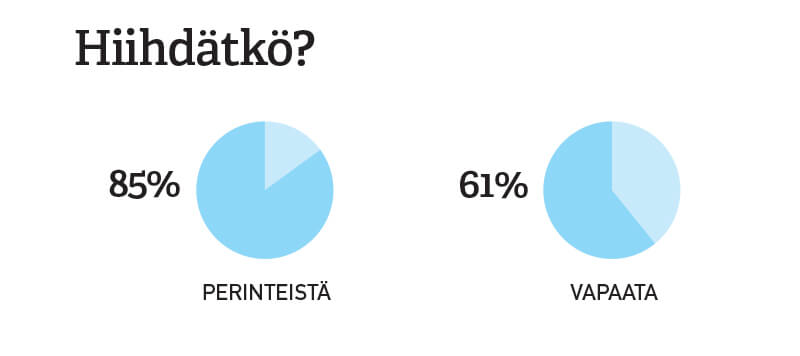 Kyselyyn vastanneista miehistä viidennes hiihtää pelkästään vapaata. Pelkkää perinteistä hiihtävissä korostuvat iäkkäämmät naiset.