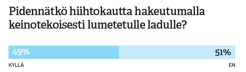 Puolet kyselyyn vastanneista kertoi pidentävänsä hiihtokautta hakeutumalla keinotekoisesti lumetetulle ladulle. Etelä-Suomen hiihtäjät erottuvat tilastossa noin 60 % osuudella, mutta Lapissakin förskottia ottaa 40 % hiihtäjistä.