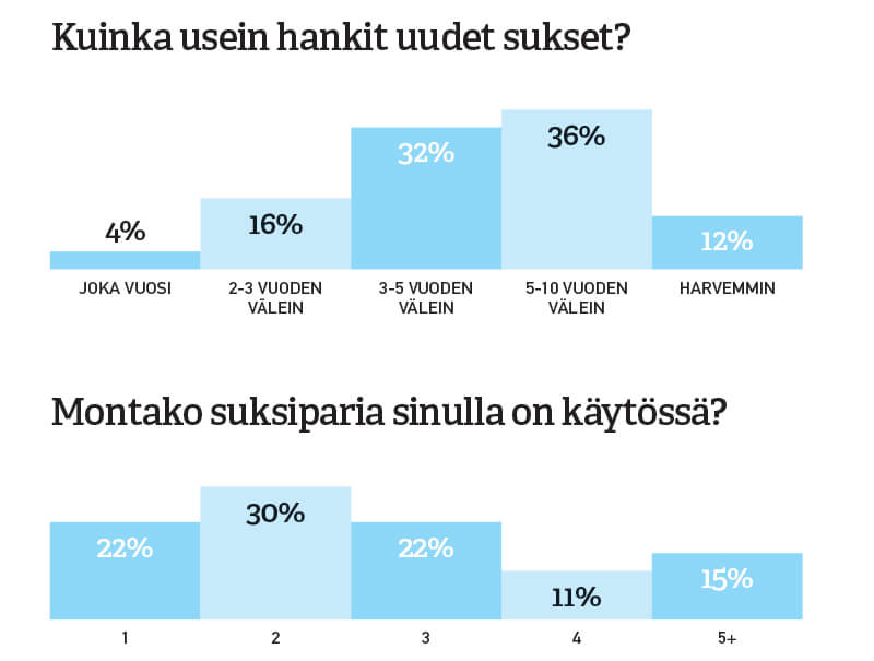Kysely kertoo, että miehillä kalustoa on selvästi enemmän. Joka neljännellä mieshiihtäjällä on vähintään viisi paria, kun naisista vastaavan määrän omistaa vain yksi kymmenestä.