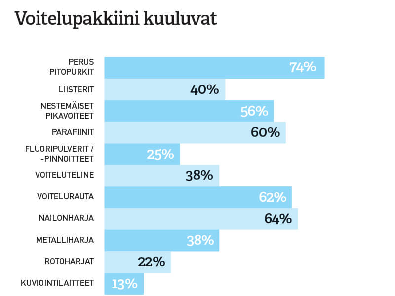 Suksien voitelua ja huoltoa kartoitettiin voitelupakin sisältöä mittaavalla kysymyksellä. Kiinnostavimmat havainnot liittyvät siihen, että purkkivoiteiden käyttäjiä (74 %) on vähemmän kuin perinteisen hiihtäjiä (85%). Ero selittynee paitsi nestemäisillä voiteilla, myös sillä, että pitopohjia hankitaan jo ainoiksi suksiksi.