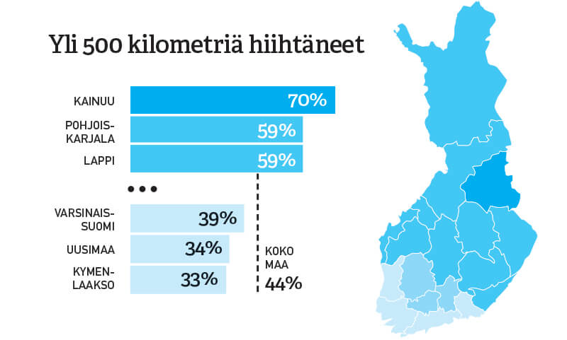 Ei ole yllätys, että Pohjois-Suomessa kilometrejä kertyi melkein kaksinkertainen määrä etelärannikkoon verrattuna. Erot kuitenkin tasoittuvat merkittävästi heti Salpausselän pohjoispuolella.