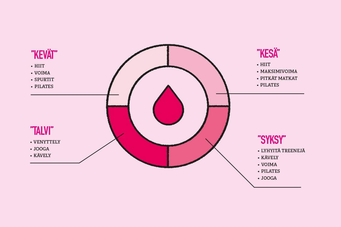 Naisen hormonikierto kestää keskimäärin 28 päivää, kun miehellä se on noin 24 tuntia. Naisen kierto kulkee siis kuunkierron mukaan, kun mies elää auringon tahdissa. Jokaisen kuukautiskierto on yksilöllinen, joten naisen on opeteltava itse kuuntelemaan oman kehonsa viestejä niin treeniensä kuin ravintonsakin optimoimiseksi. Vaikka vaihdevuosien aikana kuukautiset loppuvat, naisen syklisyys jatkaa vaikutustaan. Sopivan liikuntamuodon hahmottamiseksi yhden kuukierron voi jakaa neljään eri vaiheeseen.