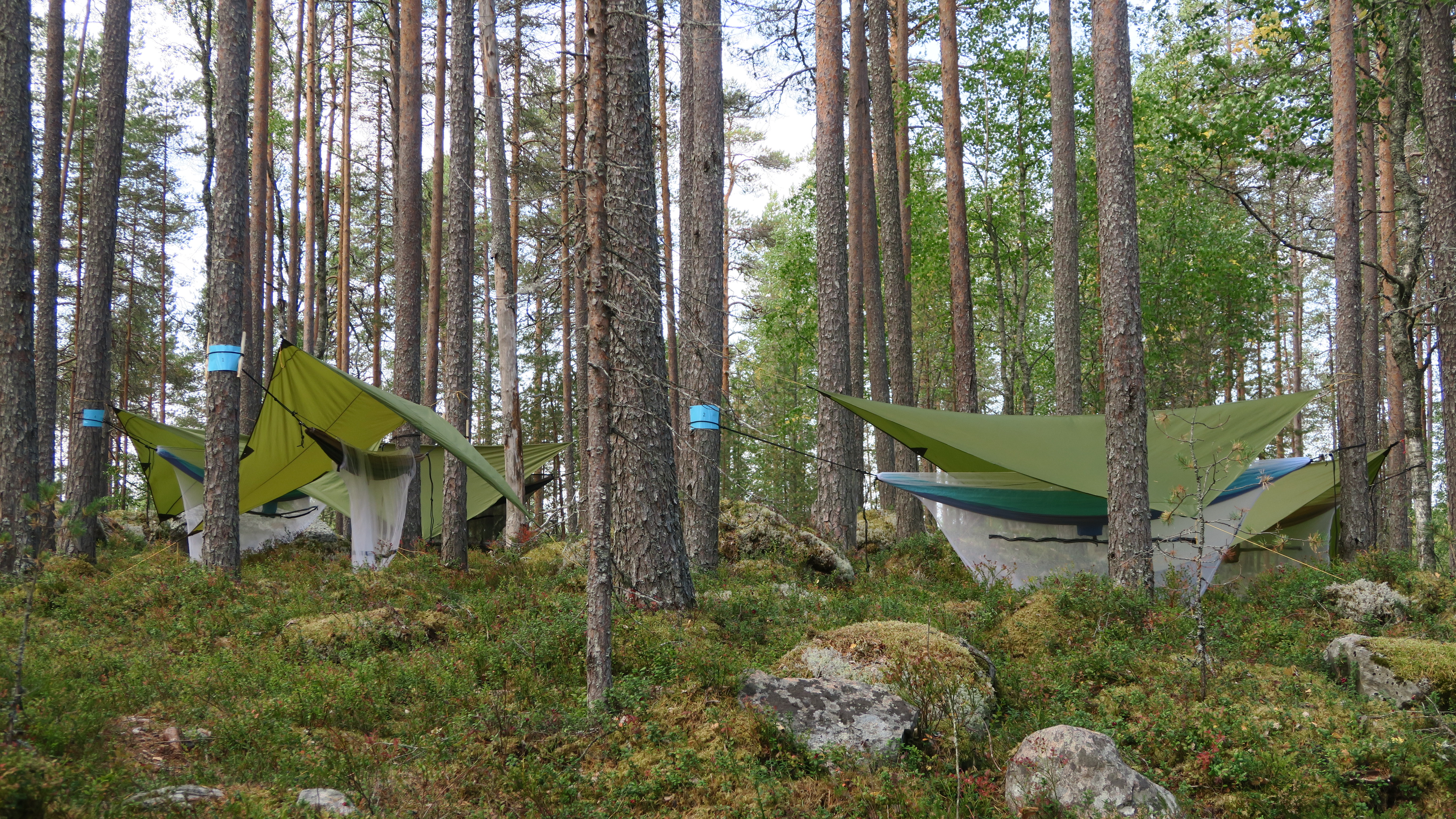 Lounaalla minulla on aikaa jututtaa kahta Kannuksesta saapunutta nuorta herraa. Antti ja Lauri Lähetkangas ovat kokeneita metsänkävijöitä ja yöpyvät äitinsä Helenan kanssa omissa riippumatoissaan. Heinäkuussa pojat kertovat olleensa Tempus-partioleirillä. Metsähotellissa he ovat jo ehtineet pyöräillä sekä muun muassa meloa ja onkia järvellä. Kokemus on tuonut retkeilijöille viisautta varusteiden hankinnassa. Riippumatot ovat viimeisen päälle ja makuupussit lämpimiä. Itsekin saan Lähetkankaan perheeltä asiantuntevia neuvoja oman riippumaton hankintaan.