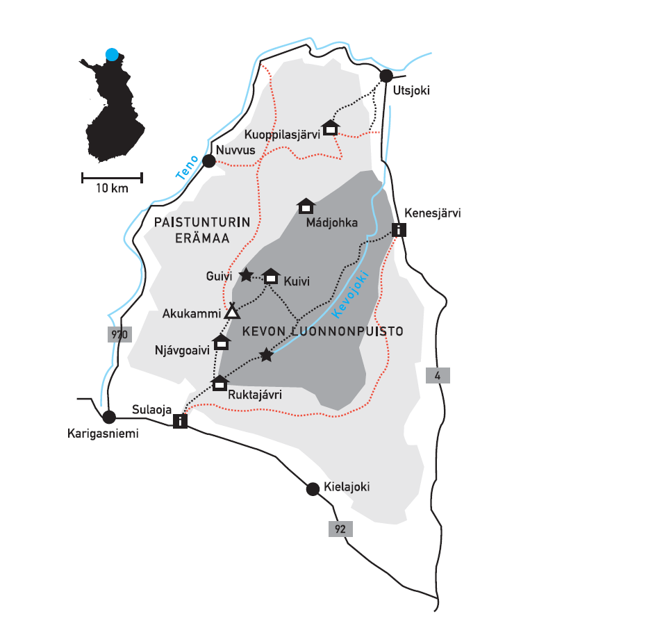 Kevon luonnonpuistoa ympäröi kolmelta puolelta Paistunturien erämaa-alue. Tenon ja Kevon välisellä alueella liikkuu ehkä enemmän kalastajia kuin retkeilijöitä, mutta Kevon etelä- ja itäpuolella on hyvin hiljaista.