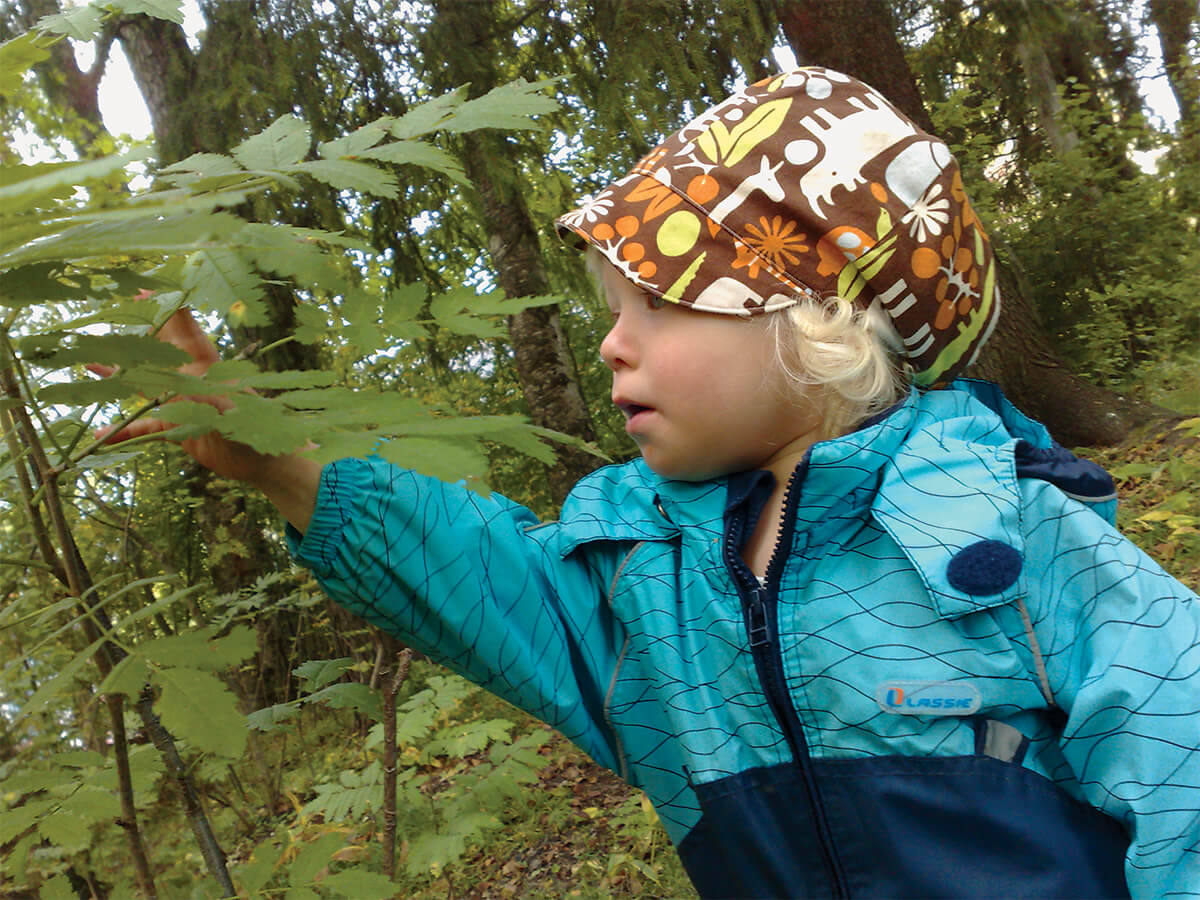 Tasapaino on koetuksella, kun jalan alla on välillä kovaa ja välillä pehmeää maastoa. Motoristen taitojen harjoittelu on kokonaisvaltaista ja sitä tapahtuu monella tasolla: keikutaan puunjuurilla, kiivetään kiven päälle, hypätään kannolta, kontataan tai ryömitään kuusen oksien alle, kurkotellaan pihlajanmarjoihin… Hienomotoriikkaa voidaan harjoitella vaikkapa keräämällä maasta neulasia tai pieniä kiviä – ja loppukesästä tietenkin napsimalla mustikoita suoraan suuhun!