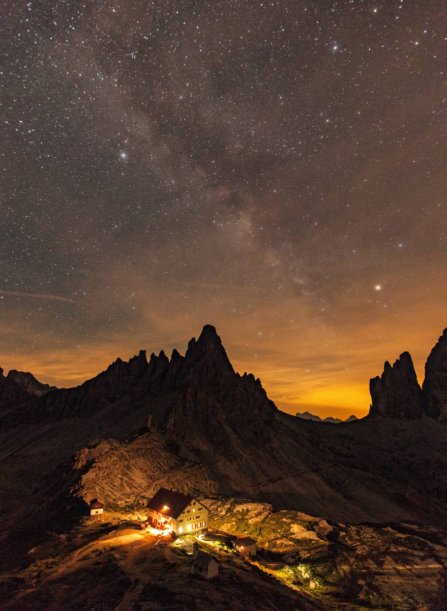 Reilun kolmen nousutunnin jälkeen saavumme Rifugio Vandellin vuoristomajalle, joka tarjoaa majoitusta. Täällä syvällä Sorapiksen sylissä on öisin niin pimeää, että Tre Cimekin jää toiseksi. Lasken illan aikana yhdeksän tähdenlentoa.