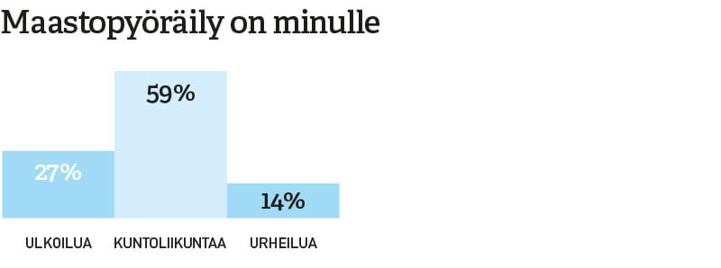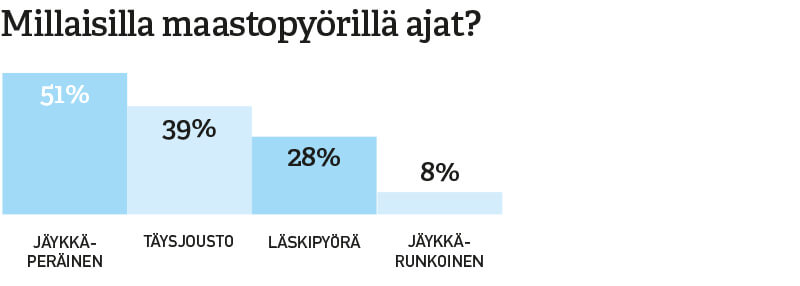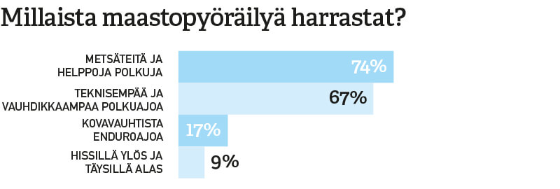 Yli puolet pyöräilybarometriin vastanneista harrastaa maastopyöräilyä. Määritelmään kuului, että lenkit poikkeavat metsäteiltä myös pienemmille poluille.