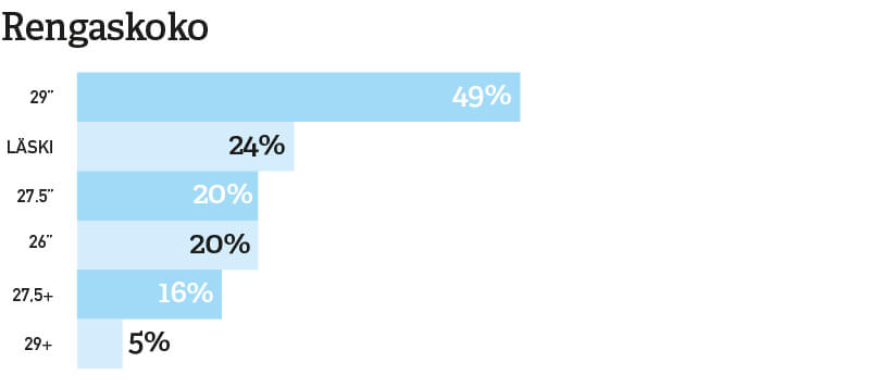29-tuumainen rengas on ylivoimaisesti suosituin. Pyörän tekniikkaa koskevat kysymykset rajattiin aktiivisessa harrastekäytössä oleviin maastopyöriin.