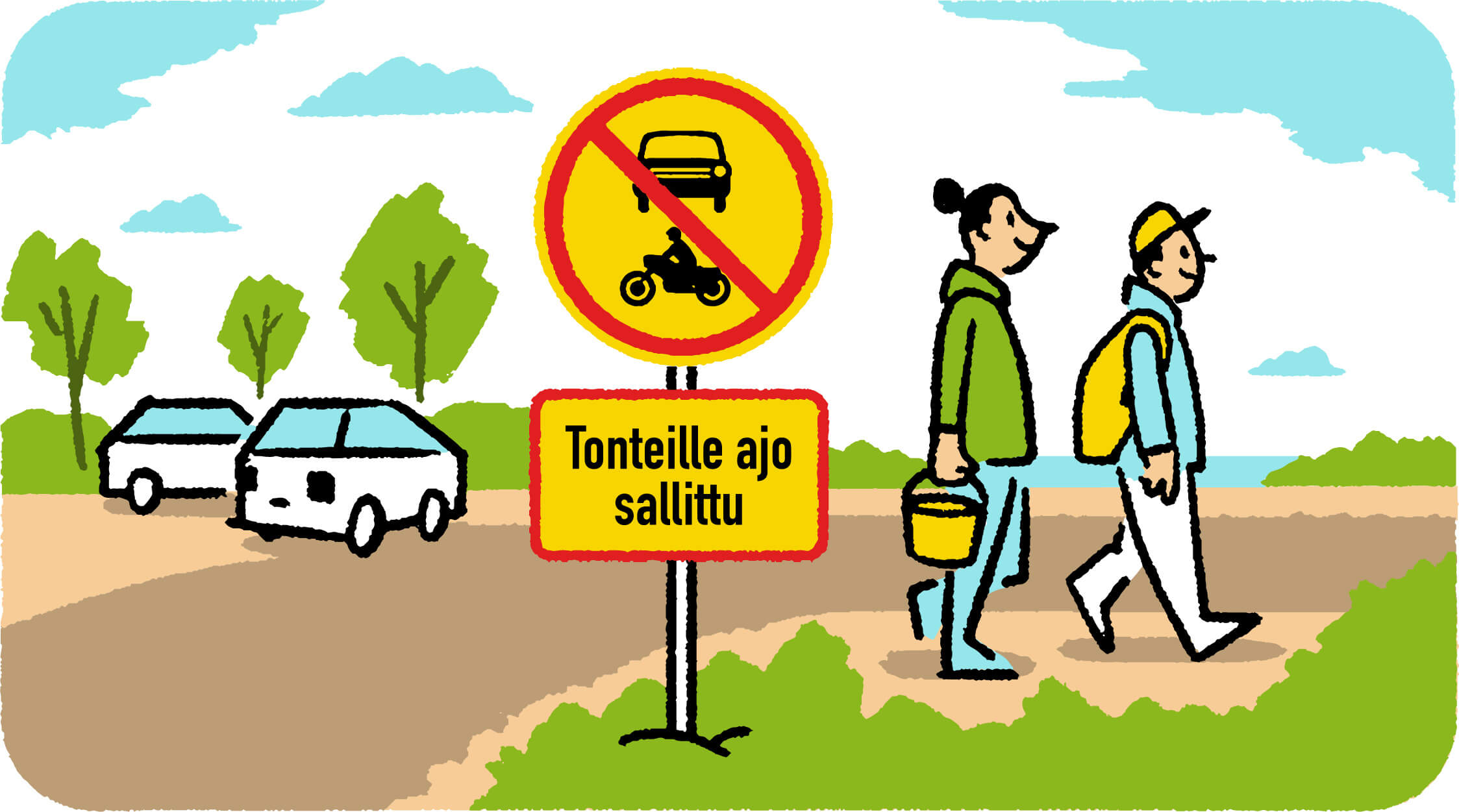 Yksitysitielain nojalla saat liikkua jalkaisin ja pyörällä yksityisteillä, mutta jos autolla ajaminen on kielletty merkillä, noudata sitä. Satunnainen ajaminen on useimmiten sallittu.