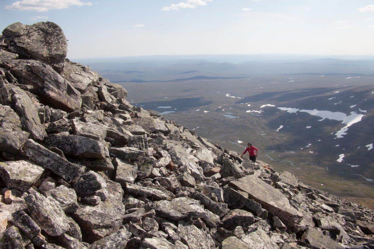 Ketterimmät vuorivuohet voivat oikaista tässä kohtaa suoraan huipulle, mutta 300 korkeuserometriä jyrkässä ja vaarallisessa louhikossa on tuskin hyvä idea. Varmempi keino ja merkitty reitti koukkaa louhikot ympäri ja nousee tunturin laelle lännen puoleiselta harjanteelta kiertäen.