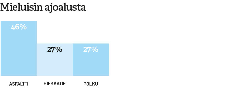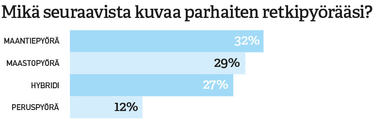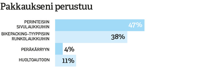 Enemmistö vastaajista suosii perinteistä maantieretkeilyä, mutta maailmalla suosiotaan kasvattava bikepacking on saapunut myös Suomeen. Pienemmille poluille hakeutuu 27 % vastanneista.