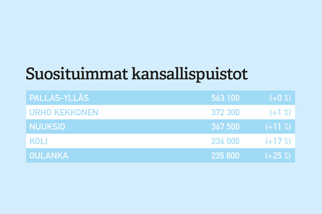 Koronavuoden kävijätilastot kertovat kansallispuistojen suosion huimasta kasvusta. Negatiivisia lukuja kirjattiin ainoastaan Linnasaaren ja Perämeren kansallispuistoissa. Ensin mainittu johtuu ainakin osittain mittalaitteen rikkoutumisesta, jälkimmäinen Ruotsin matkailun katkeamisesta. Kovinta kasvu on ollut Järvi-Suomen kansallispuistoissa (+46 %) ja maltillisinta Lapissa (+4 %).
