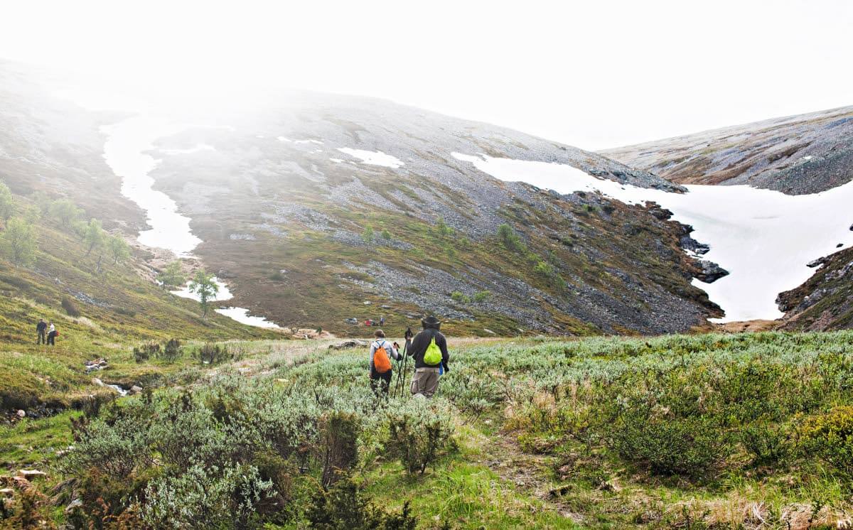Sitten levätään hetki, ihastellaan ympärillä avautuvaa vihantaa niittyä, valmistetaan lounasta ja keitetään sumpit. Trangiat ja retkikeittimet porisevat. Juomapullot täyttyvät kirkasvetiseen tunturilampeen laskevasta vesiputouksesta.