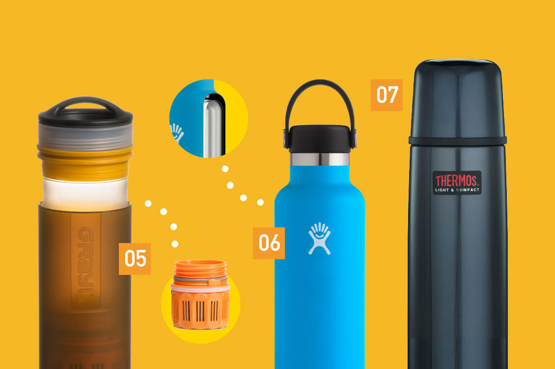 Kun juomavesi pitää puhdistaa, juomapullon ja vedenpuhdistimen yhdistelmä on kätevä ratkaisu. Grayl poikkeaa muista vastaavista siinä, että filtterin läpi ei tarvitse juoda. Puhdistin toimii pressokannun tavoin: vesi laitetaan ulompaan pulloon ja painetaan suodattimen läpi sisempään. Ultralight Compact Purifier vetää 475 millilitraa ja puhdistaa sen 15 sekunnissa. Yhden suodatinpatruunan käyttöikä on noin 150 litraa. Grayl suodattaa kemikaalit, bakteerit, alkueläimet ja monista vedenpuhdistimista poiketen myös virukset. Kokonaisuus painaa 310 grammaa.